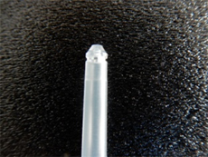 この医療用プラスチック射出成形品は臍帯血を吸い上げる際に使用される臍帯血用チップです。臍帯血には幹細胞が含まれており、赤血球・血小板などの血液の元となるため、医療現場において様々な場面で活用されています。一般的な医療用チップであれば、医療用チップの先端に穴が空いており、その穴から血液や検体、試薬の吸い上げを行いますが、この臍帯血用チップでは、チップ先端の横部分に3箇所の穴があけられています。これは、臍帯血を垂直方向に吸い上げると、吸い上げた際に臍帯血の細胞破壊が起こってしまいますが、チップ先端の3箇所の横部に開けられた大きな開口部から吸い上げることによって、臍帯血の細胞が破壊されることなく吸い上げることができるためです。この臍帯血用チップのような特注の案件であっても、プラスチック射出成形の金型設計からその後の量産まで一貫してお引き受け出来ます。