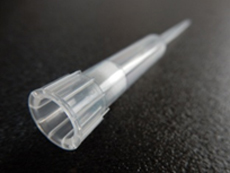 このプラスチック射出成形品は薄肉チップは医療用に使用される分注チップです。一口に医療用の薄肉チップと言っても、短いチップから長いチップ、細いチップから太いチップと多種多様なチップが医療業界の中では使用されています。この分注薄肉チップは当社がお客様と共同にて開発したチップで、肉厚が口元部分が0.3ミリの肉厚、先端部分の肉厚の厚い部分は、0.7ミリと2倍以上の肉厚差があるチップで、この分注薄肉チップの最大の特長となっています。この分注薄肉チップは肉厚の部分と肉薄の部分の肉厚差が0.4ミリと大きいため、プラスチック樹脂をゲートから充填する際にウェルドラインが発生しないように製品設計段階にて品質向上対策を含めた設計アドバイスをさせて頂いています。また、当社ではこのような医療用の薄肉チップにおいては、先端内径がφ0.4の薄肉チップのまで製作実績があります。